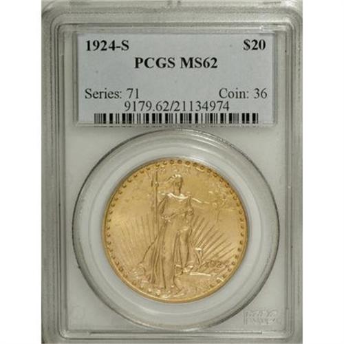 <B>1924-S $20 MS62 PCGS.</B></I> Like many dates in the series that are scarce or rare today, nearly all of the nearly 3 million coins minted were melted a decade later. In the past 50 years, small quantities have returned from European holdings, and these are the coins available today. Jeff Garrett and Ron Guth write: "During the 1940s and 1950s, it was generally believed that fewer than a half-dozen examples of this date existed!" This example is a pleasing satiny Mint State piece with light yellow-gold luster and good eye appeal. The surfaces are consistent with the grade.<BR><BR><b>Shipping:</b> Coins & Currency (<a target="_blank" href="http://www.heritageauctions.com/common/shipping.php">view shipping information</a>)