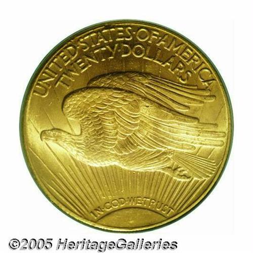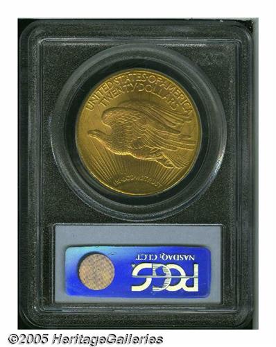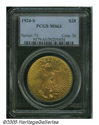 <B>1924-S<$20> MS63 PCGS.</B></I> At one time in the not-too-distant past, the 1924-S was regarded as one of the premier rarities in the Saint-Gaudens series. Although its rarity ranking has slipped following the emigration of a few hundred pieces from European bank vaults over the past 40 years, the 1924-S is still an important mintmarked Saint-Gaudens issue from the 1920s. This satiny-textured example displays noticeably fewer abrasions than the typical Uncirculated survivor. Its apricot-gold surfaces exhibits nice luster and sharply struck design elements.