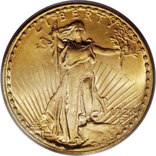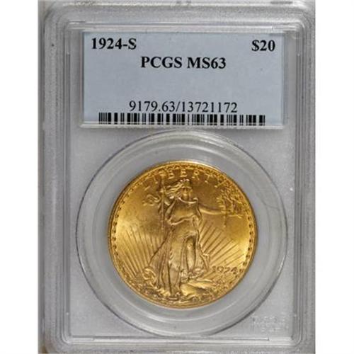 <B>1924-S $20 MS63 PCGS.</B></I> Bright and satiny, with pleasing rose accents in the fields, and a slightly greenish-honey cast overall, this Select Mint State double eagle also displays boldly struck design features and a partial wire rim. Spidery peripheral die cracks appear on both obverse and reverse, and a few minor luster grazes and abrasions limit the grade. <BR><BR><B>Coin Engraver:</B> Augustus Saint-Gaudens<BR><BR><b>Shipping:</b> Coins & Currency (<a target="_blank" href="http://www.heritageauctions.com/common/shipping.php">view shipping information</a>)