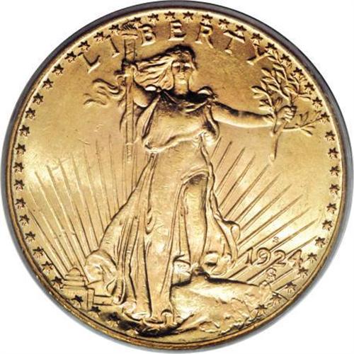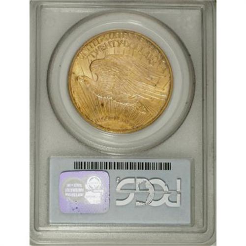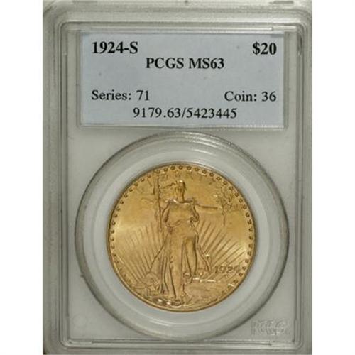 <B>1924-S $20 MS63 PCGS. CAC.</B></I> The Guide Book reports that nearly 3 million 1924-S double eagles were struck. That statistic is meaningless, since the vast majority of those pieces never left Treasury vaults prior to Roosevelt's gold recall. While hundreds of thousands of 1924 twenties made it overseas to safety, the 1924-S was heavily melted, and only several hundred survived. This lustrous yellow-gold example has a few minor marks on the sun, the obverse and eagle are unblemished, and have the look of a finer grade.<BR><I>From The Parker Lee III Collection.</B></I><BR><BR><B>Coin Engraver:</B> Augustus Saint-Gaudens<BR><BR><b>Shipping:</b> Coins & Currency (<a target="_blank" href="http://www.heritageauctions.com/common/shipping.php">view shipping information</a>)