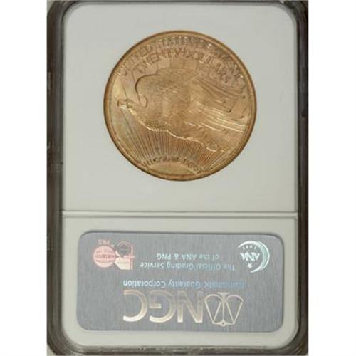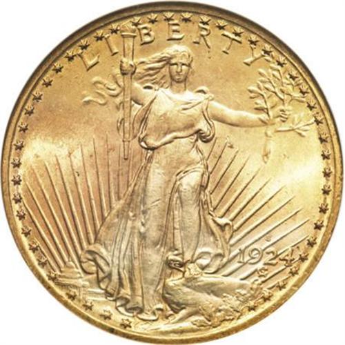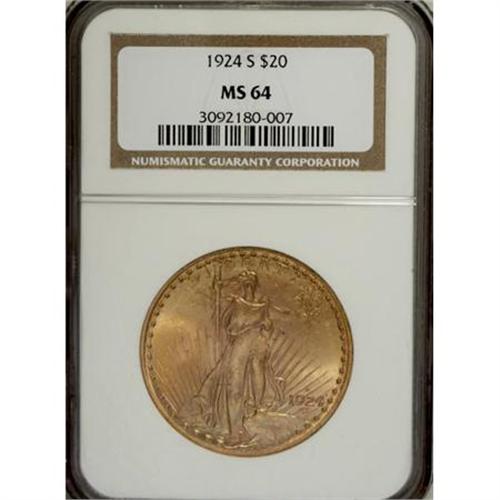<B>1924-S $20 MS64 NGC.</B></I> The 1924-S double eagle started with a mintage approaching 3 million pieces, but heavy meltings in the 1930s significantly reduced the population. The only '24-S twenties to survive were those held in French and Swiss banks, which were not many to begin with when compared with other issues, such as those from the teens. A few more were discovered in the 1950s and 1960s. All in all, enough pieces surfaced to make the issue more available through the MS63 level. Near-Gem and finer coins remain condition rarities.<BR> Highly attractive swirling luster exudes from the apricot-gold and mint-green surfaces of this MS64 example. A well executed strike leaves strong detail on the motifs, and a few minute marks define the grade.<BR><BR><B>Coin Engraver:</B> Augustus Saint-Gaudens<BR><BR><b>Shipping:</b> Coins & Currency (<a target="_blank" href="http://www.heritageauctions.com/common/shipping.php">view shipping information</a>)
