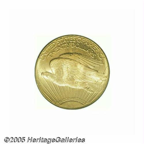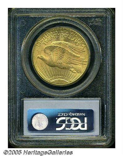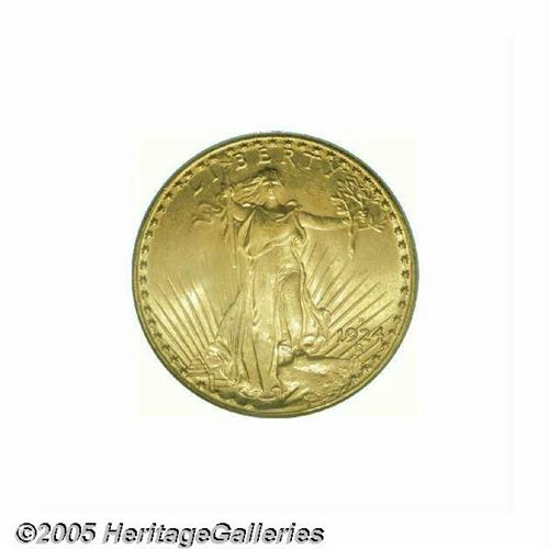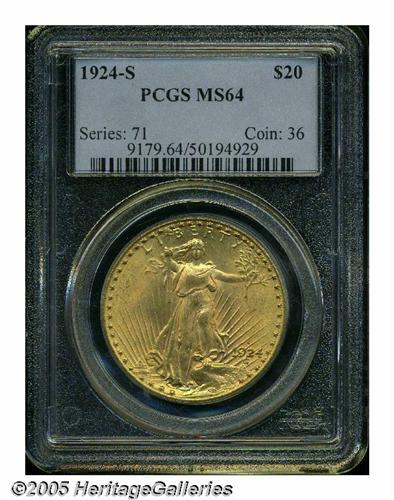 <B>1924-S<$20> MS64 PCGS.</B></I> At one time in the not-too-distant past, the 1924-S was regarded as one of the premier rarities in the Saint-Gaudens series. Although its rarity ranking has slipped following the emigration of a few hundred pieces from European bank vaults over the past 40 years, the 1924-S is still an important mintmarked Saint-Gaudens issue from the 1920s. This satiny-textured example displays noticeably fewer abrasions than the typical Uncirculated survivor and the devices are pleasingly frosted. Tinges of olive patina at the margins combine with blushes of pale orange for a fine visual effect. Gems are virtually unobtainable and very expensive, making this solidly graded example a sensible alternative for the serious collector. Population: 118 in 64, 3 finer (6/05).