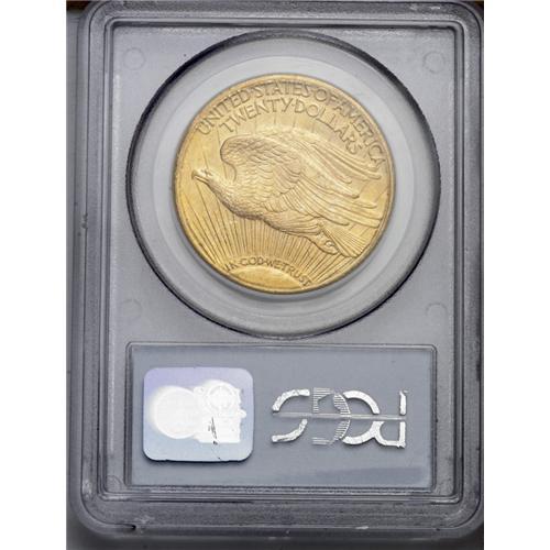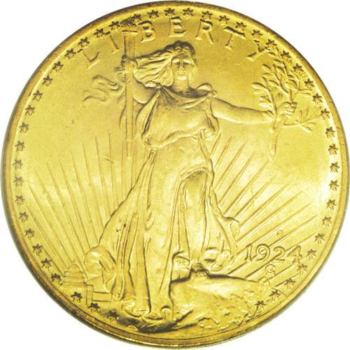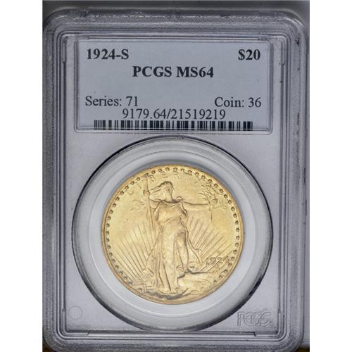 <B>1924-S<$20> MS64 PCGS.</B></I> A rarity within the Saint-Gaudens double eagle, but not nearly as rare today as was believed many years ago. Many examples have been found in European bank vaults and other overseas holdings over the past half century. David Akers commented: "At one time, the 1924-S was considered to be the rarest issue in the Saint-Gaudens series, more highly regarded than the 1920-S, 1921, 1927-D or 1933! Until the early 1950s it was thought that only five or six existed, but then a small quantity was found in Europe. Later, in the mid-1960s, a hundred or more pieces came out of Europe." Today, this issue remains a condition rarity. The example offered here is a lustrous and frosty Mint State coin with light yellow color on the obverse and honey-gold on the reverse. The surfaces are lightly abraded, consisted with the grade. An attractive and desirable example. Population: 145 in 64, 3 finer (6/06).<BR><I>From The Jackson Hole Collection.</B></I>