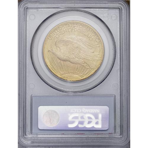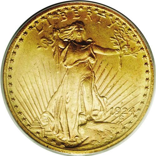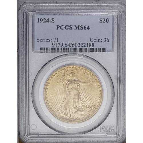 <B>1924-S<$20> MS64 PCGS.</B></I> The 1924-S double eagle, with a mintage approaching 3 million pieces, was one of the most heavily melted issues in the series. Consequently, it acquired the reputation of being the rarest date in the Saint-Gaudens series. Indeed, in the late 1940s, Max Mehl estimated that only three pieces were known. In the 1950s and 1960s, numerous examples were discovered in European banks, and the '24-S was demoted from the "rarest of the rare" to the scarce category.<BR> Most of the newly discovered 1924-S double eagles were in MS63 and lower grades. Near-Gem and finer examples are still challenging. The MS64 coin presented in this lot displays sharp definition on the design features, including on the peripheral lettering, which is often weak on this issue. The pebbly-like surfaces reveal honey-gold patina imbued with traces of light green. The faces on both sides are well preserved, though some minor rim marks are mentioned for accuracy. Population: 145 in 64, 3 finer (3/06).
