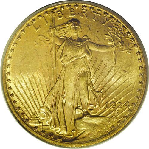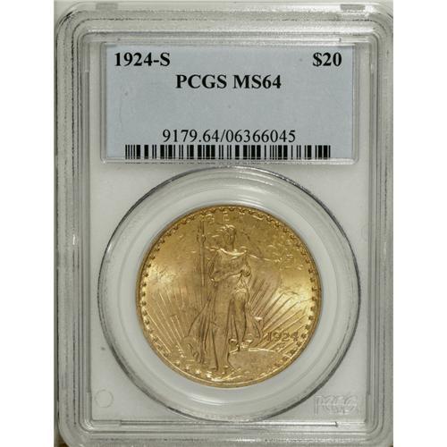 <B>1924-S $20 MS64 PCGS.</B></I> The 1924-S is a median scarcity in the Saint-Gaudens series and is very similar in both overall population and condition rarity to the 1924-D, also a heavily melted branch mint issue of comparable mintage. This satiny representative is notable for its soft, frosted sheen and blatant originality. Tinges of pale orange and green-gold patina highlight each side. Abrasions are well scattered and generally shallow, a few of the more noticeable marks being found near the base of Liberty's torch. The quantity of MS64s in this sale aside, a difficult issue in Choice condition.<BR><BR><b>Shipping:</b> Coin/Currency (<a target="_blank" href="http://www.heritageauctions.com/common/shipping.php">view shipping information</a>)