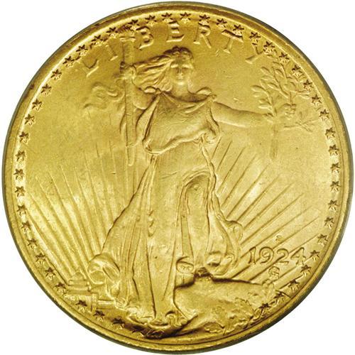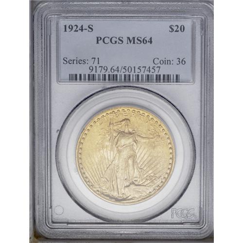 <B>1924-S<$20> MS64 PCGS.</B></I> While far from the overall rarity that it was 30-40 years ago, the supply of Choice Mint State 1924-S Saints is still quite limited while Gems are rare and prohibitively expensive for many collectors. Offered here is an especially appealing example with reddish-tinged, grainy surfaces and a soft, frosted sheen. The strike is more than adequate for the issue and is particularly sharp considering the late die state, as identified by peripheral die cracks on each side. Abrasions are light and generally well scattered, with no individual marks being of any real consequence. <BR><BR><B>Important notice:</B> Heritage usually auctions material at the rate of 200-250 lots per hour. On some occasions eBay Live bid software or the Internet may not be able to keep up with the pace of the auction. We recommend placing a realistic absentee bid now as insurance to avoid disappointment. Occasionally the auctioneer may eliminate or reject an eBay Live bid, and the auctioneer may also reopen a lot after the close of the eBay live bidding (usually because we missed an audience bid), and may reject your bid even if it shows you as the winning bidder. By bidding via eBay Live, you agree that Heritage may award the lot to another bidder at its sole discretion under the circumstances described above or any other reasonable circumstances. Since eBay bids are not shown to us until we open the lot on the floor, we treat those bids just like floor bids. In most cases the floor responds before the eBay bid is presented to us, due to Internet lag time, so for consistency we have made it a policy that floor bids are always considered first over tie eBay live bids. Also please note that all Heritage lots purchased through eBay Live carry a 20% Buyer's Premium. Please make sure you read the Terms and Conditions before you bid. This lot is being auctioned in conjunction with a live floor auction by Heritage Galleries & Auctioneers. All final auction and invoice information will be supplied by Heritage Galleries & Auctioneers, and all other information should be considered preliminary. Lot:4721 <BR><BR><B>Winning Notification and Billing:</B> After the FINAL session in this auction is complete, Heritage will send e-mail and snail mail invoices. This process normally takes several days. All final auction and invoice information will be supplied by Heritage Galleries & Auctioneers, and all other information should be considered preliminary. <BR><BR>This auction will be conducted on a live auction floor and over the Internet through eBay Live. If you choose to place an absentee bid, please take a moment to <font color='#0000ff'><u><a href='http://pages.ebay.com/liveauctions/help/before/laabsentee.html'>learn how eBay Live absentee bidding works</a></u></font><font color='#000000'>