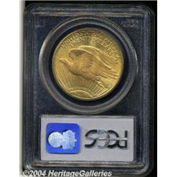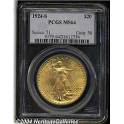 <B>1924-S<$20> MS64 PCGS.</B></I> Even though numerous examples of the '24-S were found in Europe in the 1960s, most grade no better than MS60-62 because of extensive abrasions. Pieces such as this are rarely encountered and well worth the attention of specialists. The surfaces have a soft, frosted texture and are minimally abraded with no singularly important marks on either side. Lovely orange-gold color is also seen. Population: 44 in 64, 3 finer (3/04). <BR><BR><B>Important notice:</B> Heritage usually auctions material at the rate of 200-250 lots per hour. On some occasions eBay Live bid software or the Internet may not be able to keep up with the pace of the auction. We recommend placing a realistic absentee bid now as insurance to avoid disappointment. Occasionally the auctioneer may eliminate or reject an eBay Live bid, and the auctioneer may also reopen a lot after the close of the eBay live bidding (usually because we missed an audience bid), and may reject your bid even if it shows you as the winning bidder. By bidding via eBay Live, you agree that Heritage may award the lot to another bidder at its sole discretion under the circumstances described above or any other reasonable circumstances. Since eBay bids are not shown to us until we open the lot on the floor, we treat those bids just like floor bids. In most cases the floor responds before the eBay bid is presented to us, due to Internet lag time, so for consistency we have made it a policy that floor bids are always considered first over tie eBay live bids. Also please note that all Heritage lots purchased through eBay Live carry a 20% Buyer's Premium. Please make sure you read the Terms and Conditions before you bid. </span></font></tr></table></td></tr></table>