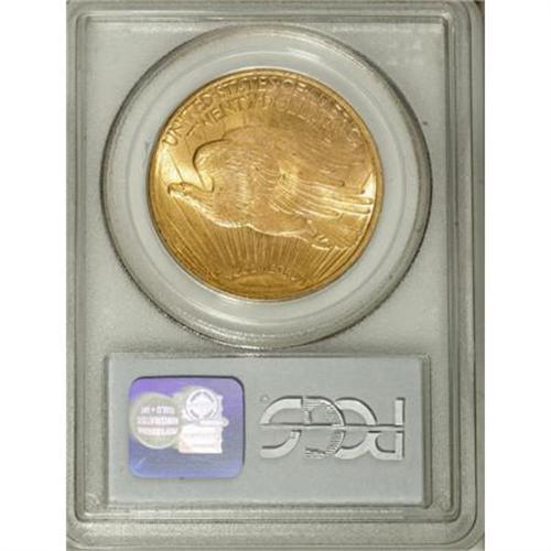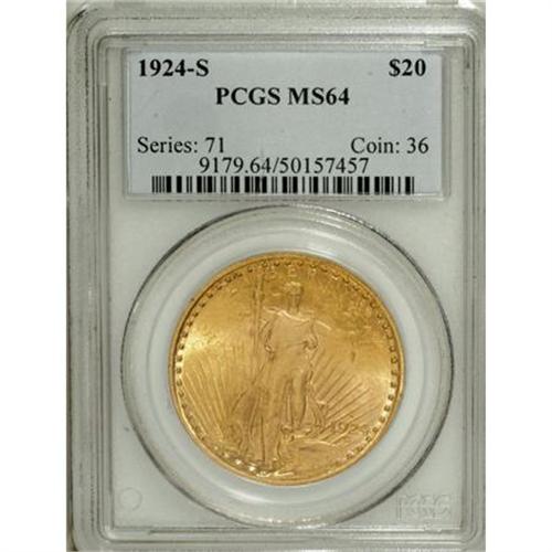 <B>1924-S $20 MS64 PCGS.</B></I> The 1924-S comes with a mintage of nearly 3 million pieces, most of which succumbed to the melting pots of the 1930s. The coins available to collectors today, mostly in the lower grades of Mint State, survived in overseas banks, returning to the United States in the 1950s and 1960s (Jeff Garrett and Ron Guth, 2006).<BR> The near-Gem specimen presented in the current lot displays rich apricot-gold color and glowing luster. A well executed strike manifests itself with sharp definition on most of the design elements, accentuating the coin's eye appeal. A few light obverse marks limit the grade. Population: 88 in 64, 3 finer (4/07).<BR><BR><b>Shipping:</b> Coins & Currency (<a target="_blank" href="http://www.heritageauctions.com/common/shipping.php">view shipping information</a>)