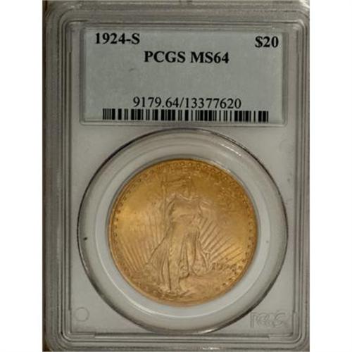 <B>1924-S $20 MS64 PCGS.</B></I> The challenging nature of the 1924-S double eagle, however tough it may seem today, pales in comparison to numismatists' perception of it half a century ago. Then, the government destruction of this issue seemed to border on the absolute; as put by Garrett and Guth (2006), "[d]uring the 1940s and 1950s, it was generally believed that fewer than a half-dozen examples of this date existed!"<BR> This satiny near-Gem piece is predominantly orange-gold with a handful of lighter zones in the fields. The surfaces show significant haze, particularly on the obverse, which is suggestive of the long-term storage and repatriation that made this issue more accessible to collectors. Light flaws on and around the well-defined devices preclude a better designation. Highly elusive any finer, with just three such pieces certified by PCGS (11/07).<BR><BR><B>Coin Engraver:</B> Augustus Saint-Gaudens<BR><BR><b>Shipping:</b> Coins & Currency (<a target="_blank" href="http://www.heritageauctions.com/common/shipping.php">view shipping information</a>)