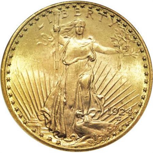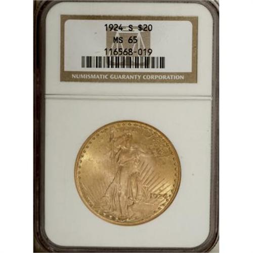 <B>1924-S $20 MS65 NGC.</B></I> The 1924-S was at one time considered to be among the rarest of <I>all</B></I> double eagle issues, outranking "the famous MCMVII Ultra High Relief and the incredible Proofs of 1883 and 1884," in the words of Q. David Bowers' double eagle <I>Guide Book.</B></I> Thanks to repatriations from overseas hoards, today the 1924-S is only considered "very rare," and it remains illustrious and noteworthy in Gem condition. This exceptionally pleasing specimen is well defined, with bright, sparkling honey-gold surfaces that are nearly abrasion-free, except for a few inconsequential bagmarks. As a testament to its rarity and desirability, both NGC and PCGS have each graded only a single specimen finer (12/07).<BR><BR><B>Coin Engraver:</B> Augustus Saint-Gaudens<BR><BR><b>Shipping:</b> Coins & Currency (<a target="_blank" href="http://www.heritageauctions.com/common/shipping.php">view shipping information</a>)