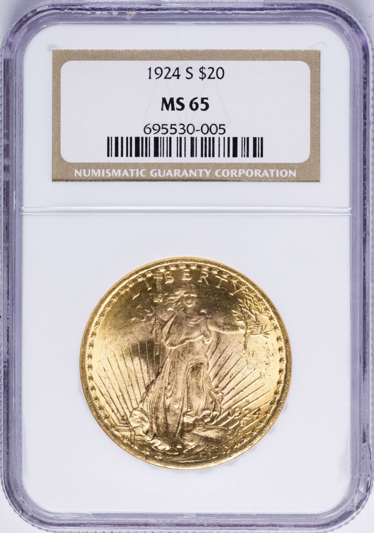One 1924-S $20 St. Gaudens Double Eagle Gold Coin NGC Graded MS65. EXTEMELY RARE! The present coin is a delightful Gem, with well-detailed design elements and well-preserved yellow and rose-gold surfaces that show only minor signs of contact. Vibrant mint luster radiates from both sides and eye appeal is outstanding. From a large mintage of 2.9 million pieces, the 1924-S Saint-Gaudens double eagle was one of the most challenging issues of the series in the 1940s, when collecting twenty dollar gold pieces first became popular in this country. It seems that most of the mintage was held in government stockpiles until the Gold Recall of 1933, and subsequently melted and stored as gold bars at the Fort Knox Bullion Repository. Roger W. Burdette discovered about 250,000 coins were distributed to Federal Reserve Banks, but far fewer actually reached circulation in this country.