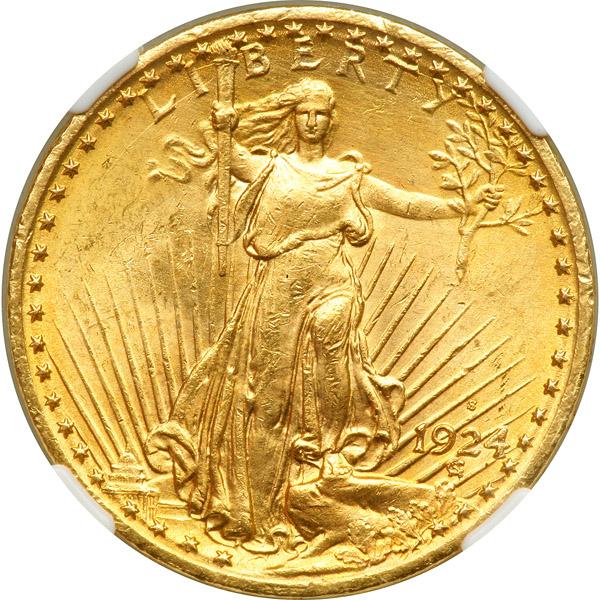 1924-S $20 St. Gaudens. NGC graded Unc Details, improperly cleaned. We note some contact marks about the rims and faint hairlines due to cleaning (PCGS # 9179) .