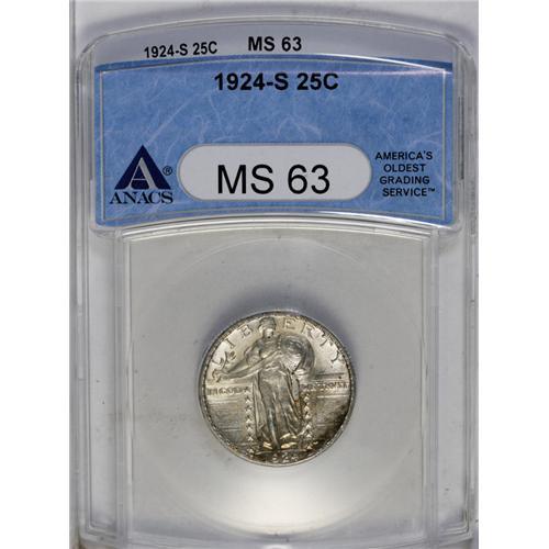 <B>1924-S<25C> MS63 ANACS.</B></I> A lovely example of this San Francisco issue, for the grade, with bold striking details and smooth, unmarked surfaces. A few small spots on the obverse limit the grade. Dappled reddish-gold and cobalt-blue toning appears near the lower right obverse and upper right reverse borders.