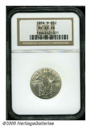 <B>1924-S<25C> MS63 Full Head NGC.</B></I> Lustrous and well struck, with faint tangerine haze on the high points and peripheries. Some light wispy abrasions account for the grade, but impact the ample eye appeal little.