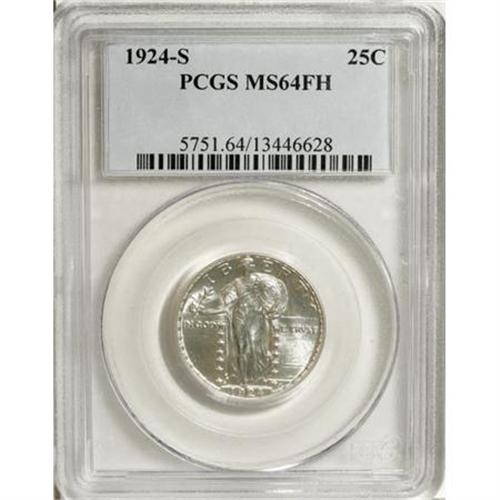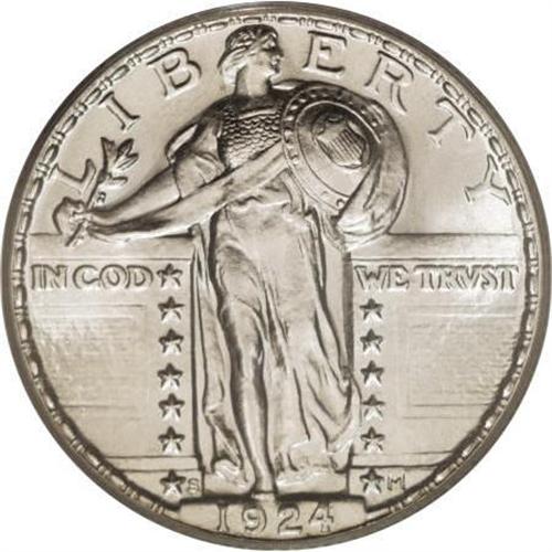<B>1924-S 25C MS64 Full Head PCGS.</B></I> Liberty's head is needle-sharp, and the date is also exactingly defined. Only the two shield rivets near the waist lack absolute detail. This brilliant and highly lustrous near-Gem has an outstanding obverse, and is limited in grade only by minor grazes beneath the left (facing) wing. Population: 52 in 64 Full Head, 37 finer (8/07).<BR><BR><B>Coin Engraver:</B> Hermon A. MacNeil<BR><BR><b>Shipping:</b> Coins & Currency (<a target="_blank" href="http://www.heritageauctions.com/common/shipping.php">view shipping information</a>)