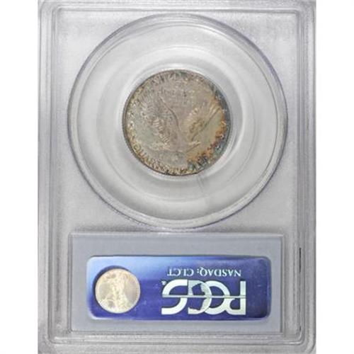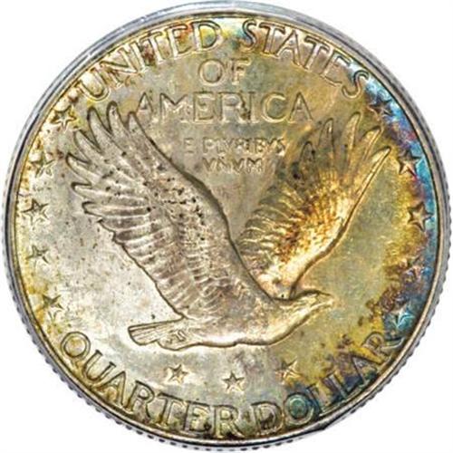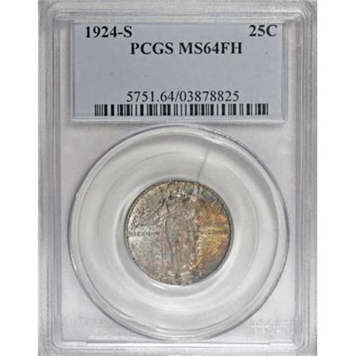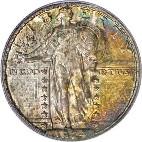 <B>1924-S 25C MS64 Full Head PCGS.</B></I> Splashes of cobalt-blue, golden-brown, and lavender toning make uneven visits to the radiantly lustrous surfaces of this near-Gem. The well executed strike culminates in a Full Head on Liberty, along with strong definition on the chain mail and the vertical stripes of the shield. Well preserved surfaces reveal just a couple of small reverse marks. Population: 53 in 64 Full Head, 37 finer (10/07).<BR><BR><B>Coin Engraver:</B> Hermon A. MacNeil<BR><BR><b>Shipping:</b> Coins & Currency (<a target="_blank" href="http://www.heritageauctions.com/common/shipping.php">view shipping information</a>)