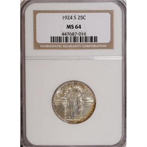 <B>1924-S 25C MS64 NGC.</B></I> This high-mintage issue is typically not well struck, according to expert J. H. Cline. The current near-Gem only misses Full Head detail by a fraction, but Liberty's sash and a couple of the shield rivets are weakly impressed. Lustrous with light peripheral toning on the obverse, and few marks on either side. <BR><BR><B>Coin Engraver:</B> Hermon A. MacNeil<BR><BR><b>Shipping:</b> Coins & Currency (<a target="_blank" href="http://www.heritageauctions.com/common/shipping.php">view shipping information</a>)