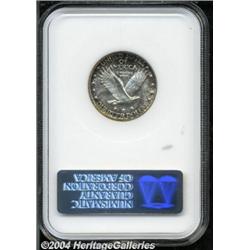 <B>1924-S<25C> MS65 NGC.</B></I> Flashy luster emblazes both sides of this sharply struck S-mint quarter. The obverse is toned a golden-brown in the center framed by gunmetal-blue and violet, while the reverse features russet and lavender mottling around the borders, and a nearly untoned, brilliant central area. No significant abrasions are apparent on the immaculate surfaces possessed by this gorgeous Standing Liberty quarter. Population: 43 in 65, 17 finer (4/04). <BR><BR><B>Important notice:</B> Heritage usually auctions material at the rate of 200-250 lots per hour. On some occasions eBay Live bid software or the Internet may not be able to keep up with the pace of the auction. We recommend placing a realistic absentee bid now as insurance to avoid disappointment. Occasionally the auctioneer may eliminate or reject an eBay Live bid, and the auctioneer may also reopen a lot after the close of the eBay live bidding (usually because we missed an audience bid), and may reject your bid even if it shows you as the winning bidder. By bidding via eBay Live, you agree that Heritage may award the lot to another bidder at its sole discretion under the circumstances described above or any other reasonable circumstances. Since eBay bids are not shown to us until we open the lot on the floor, we treat those bids just like floor bids. In most cases the floor responds before the eBay bid is presented to us, due to Internet lag time, so for consistency we have made it a policy that floor bids are always considered first over tie eBay live bids. Also please note that all Heritage lots purchased through eBay Live carry a 20% Buyer's Premium. Please make sure you read the Terms and Conditions before you bid.