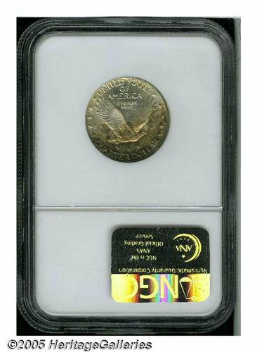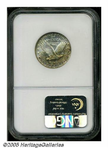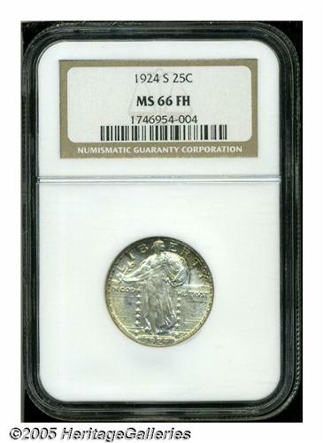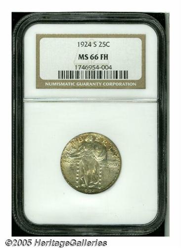 <B>1924-S<25C> MS66 Full Head NGC.</B></I> Equally as rare as its D-mint counterpart, the 1924-S Standing Liberty quarter is a prized commodity in any Full Head level of preservation. A wondrously original specimen, both sides exhibit silver-gray patina that yields to russet-orange, florescent-pink, and lemon-yellow hues about the borders. Although the strike wanes slightly over Liberty's gown lines, the all-important head features are razor-sharp. A fateful contact mark bisects Liberty's cheek, seemingly preventing the Superb Gem grade designation, while a faint blemish below UNUM is the only other surface disturbance worth mentioning. Even the casual collector of the series should be captivated by this alluring premium Gem. Population: 2 in 66, 2 finer (6/05).