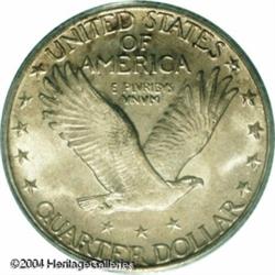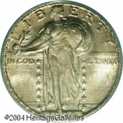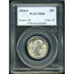 1924-S 25C MS66 PCGS. The rich endowment of frosty <B>1924-S 25C MS66 PCGS.</B></I> The rich endowment of frosty luster pounds through the holder uninhibited by the pale golden patina noted on both sides. Save for Liberty's head, the strike is adequate for a Type Two Quarter from the California branch mint. Both sides exhibit an undisturbed appearance that is all but unsurpassable in terms of technical and aesthetic appeal. <BR><BR><B>Important notice:</B> Heritage usually auctions material at the rate of 200-250 lots per hour. On some occasions eBay Live bid software or the Internet may not be able to keep up with the pace of the auction. We recommend placing a realistic absentee bid now as insurance to avoid disappointment. Occasionally the auctioneer may eliminate or reject an eBay Live bid, and the auctioneer may also reopen a lot after the close of the eBay live bidding (usually because we missed an audience bid), and may reject your bid even if it shows you as the winning bidder. By bidding via eBay Live, you agree that Heritage may award the lot to another bidder at its sole discretion under the circumstances described above or any other reasonable circumstances. Since eBay bids are not shown to us until we open the lot on the floor, we treat those bids just like floor bids. In most cases the floor responds before the eBay bid is presented to us, due to Internet lag time, so for consistency we have made it a policy that floor bids are always considered first over tie eBay live bids. Also please note that all Heritage lots purchased through eBay Live carry a 20% Buyer's Premium. Please make sure you read the Terms and Conditions before you bid. This lot is being auctioned in conjunction with a live floor auction by Heritage Galleries & Auctioneers. All final auction and invoice information will be supplied by Heritage Galleries & Auctioneers, and all other information should be considered preliminary. Lot:5960