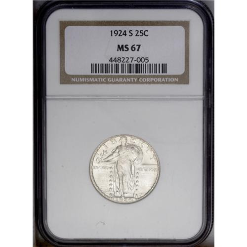<B>1924-S<25C> MS67 NGC.</B></I> Swirling mint frost is easily the most impressive feature of this untoned Superb Gem. Of course, the smooth surfaces are also worthy of special attention, and neither side reveals even the most trivial distraction. Except for some characteristic striking softness over the focal features, the definition is suitably bold for the type. An interesting, high grade alternative to an elusive Full Head representative. Census: 4 in 67, 1 finer (3/06).<BR><I>From The David L. Goodwin Collection.</B></I>