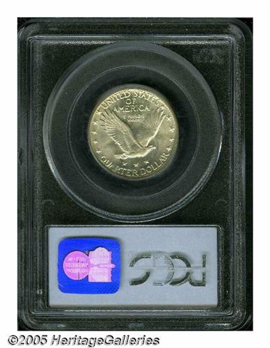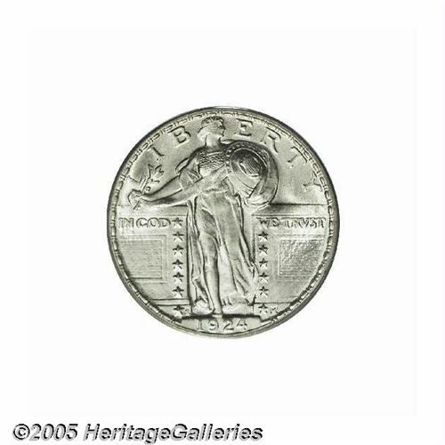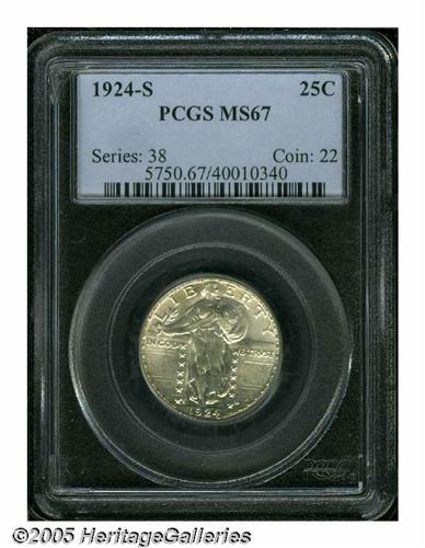 <B>1924-S<25C> MS67 PCGS.</B></I> Snow white in color and highly lustrous for this elusive date. The strike is far better than often seen, with Liberty's head about 75 percent full, including the leaves on Liberty's head. A couple of the shield bosses are flat too. For this date and mint, the surfaces are outstanding. Close study will note a couple of tiny ticks above GOD, and below Liberty's knee on her left leg. The reverse is very clean and study reveals no distracting marks or nicks. Slight haze can be seen on the reverse, but this fails to dampen our enthusiasm for this spectacular Gem coin. One of many dates which is notorious for its weak strikes, and this one is quite scarce in this lofty grade. Population: 2 in 67, 0 finer (6/05).