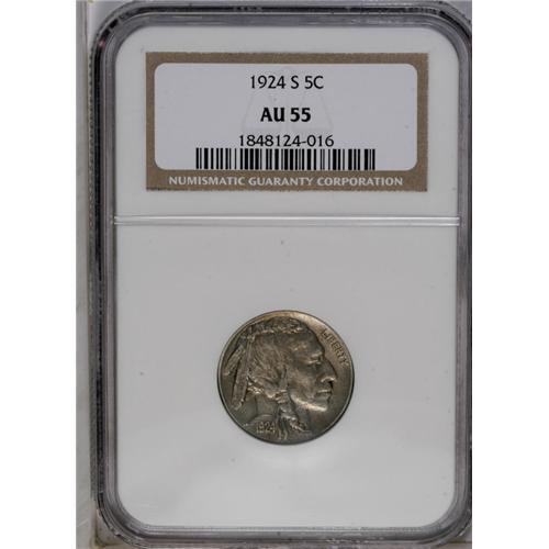 <B>1924-S<5C> AU55 NGC.</B></I> Medium gray color with steaks of pale gold toning. Sharply struck for a '24-S Buffalo.