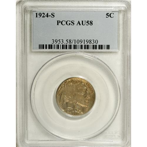 <B>1924-S 5C AU58 PCGS.</B></I> Lightly gold-toned overall with softly lustrous surfaces. A hint of friction affects the devices, which display this issue's typical weakness on the braid and on the bison's head and shoulder.<BR><BR><b>Shipping:</b> Coin/Currency (<a target="_blank" href="http://www.heritageauctions.com/common/shipping.php">view shipping information</a>)
