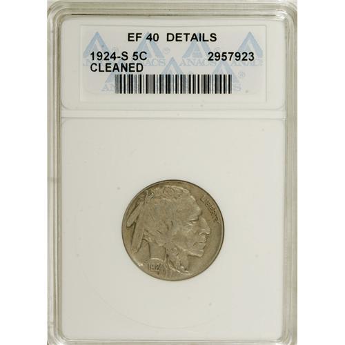 <B>1924-S 5C --Cleaned--ANACS. XF40 Details.</B></I> NGC Census: (11/192). PCGS Population (30/313). Mintage: 1,437,000. Numismedia Wsl. Price: $830. (#3953)<BR><BR><b>Shipping:</b> Coins & Currency (<a target="_blank" href="http://www.heritageauctions.com/common/shipping.php">view shipping information</a>)