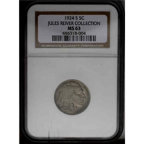 <B>1924-S<5C> MS63 NGC.</B></I> A low mintage issue that is elusive in all grades and especially difficult with a decent strike. This piece has soft, frosted mint luster and is light in color. Unabraded, but showing a handful of carbon flecks on each side. Reasonably well struck on the reverse, the obverse center displays a lack of full highpoint definition.