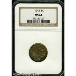 <B>1924-S 5C MS64 NGC.</B></I> The low mintage 1924-S has emerged as one of the premier rarities in the Buffalo Nickel series at the Uncirculated level. Mint State survivors tend to be better struck than other mintmarked issue from this decade, but difficulty in locating Gems remains very high. This moderately toned example is well struck with a few wispy contact marks over the central devices. Importantly, this piece once resided in an ANACS MS65 holder, #EX5186, which accompanies the lot. Lot:5998
