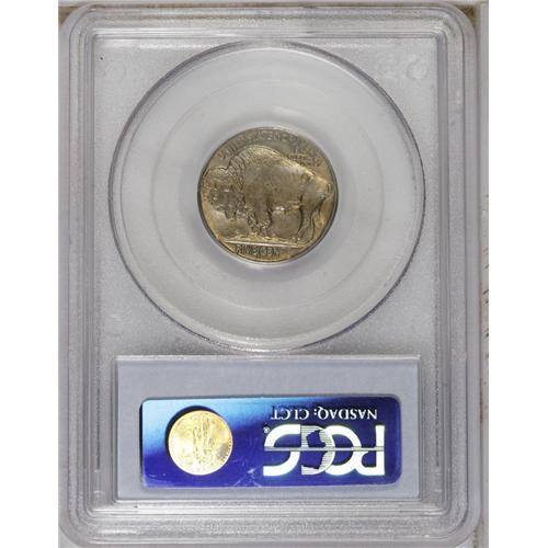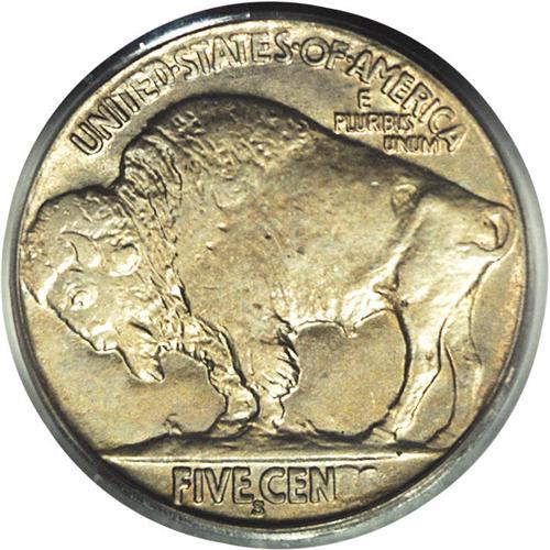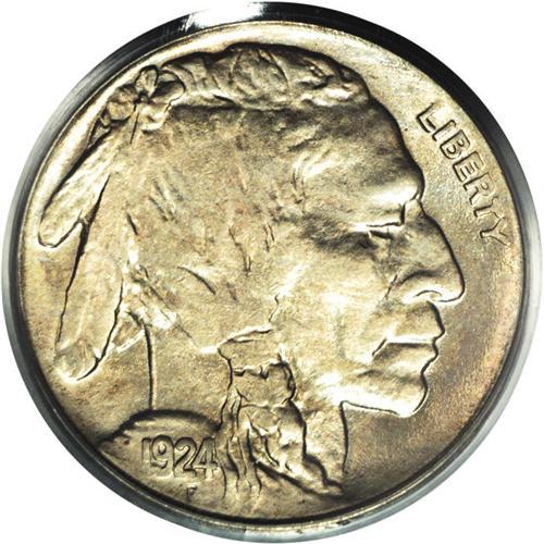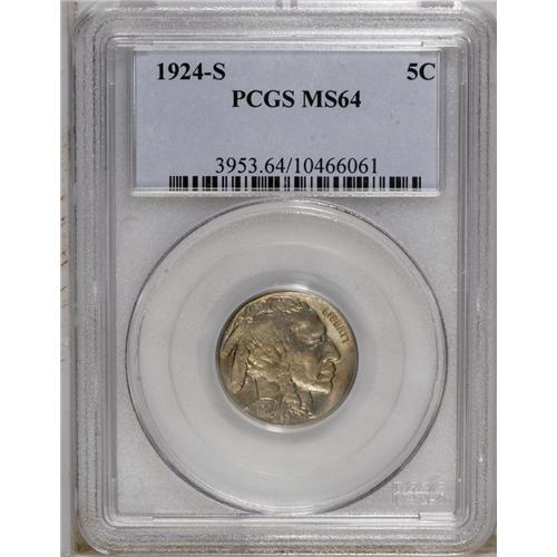<B>1924-S<5C> MS64 PCGS.</B></I> The 1924-S is nearly the equal of such notorious issues as the 1919-S and 1926-S in terms of strike. While this piece is not fully struck, especially on the TS of CENTS, which may have been struck-through grease, the bison and Indian have more detail than on many examples. The surfaces have attractive gold and aqua patina, and soft, pleasing luster shines beneath. The deciding factor, eye appeal, is high. A remarkable example that would fit well with a high-grade date set.