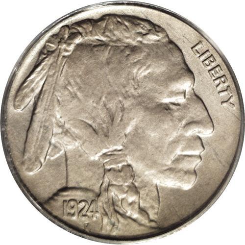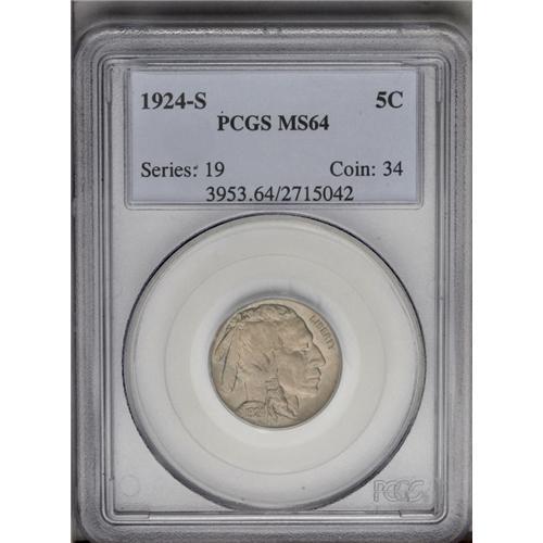 <B>1924-S<5C> MS64 PCGS.</B></I> Well struck for this elusive S-mint Buffalo, with an abundant amount of golden-gray and rose patina in the recesses. The 1924-S is scarce even in lesser worn conditions, and at all levels of Mint State it is a highly respected issue. Gems are not only costly, but rarely offered. PCGS has graded 33 finer (4/06).