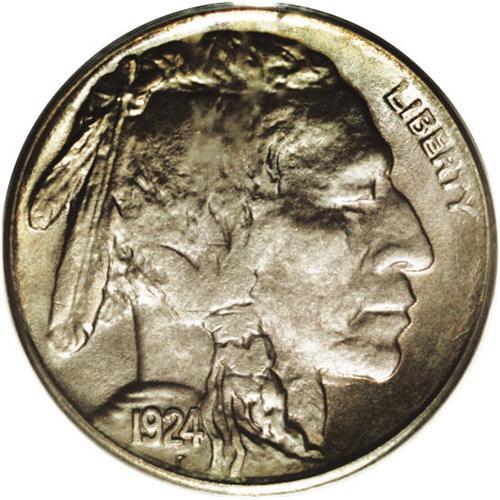 <B>1924-S<5C> MS65 PCGS.</B></I> Although produced in greater numbers, the 1924-S is nearly as rare as the 1926-S in all Mint State grades. Of course, the original mintage of the '24-S is still limited for 20th century U.S. nickel. Only 1.4 million pieces were produced, most with appreciably bold definition. The problem as far as advanced collectors are concerned is that few pieces were kept from circulation. This is a sharply impressed survivor with well above average detail for a Buffalo nickel from the San Francisco branch mint including a full, sharp horn. The surface preservation is remarkable--not only is there no wear, but neither side reveals any bothersome abrasions or carbon flecks. Attractive steel-blue and sunset-rose toning is seen on both sides. Population: 32 in 65, 1 finer (4/06).