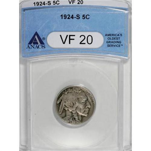 <B>1924-S 5C VF20 ANACS.</B></I> NGC Census: (63/330). PCGS Population (63/459). Mintage: 1,437,000. Numismedia Wsl. Price for NGC/PCGS coin in VF20: $365. (#3953)<BR><BR><B>Coin Engraver:</B> James E. Fraser<BR><BR><b>Shipping:</b> Coins & Currency (<a target="_blank" href="http://www.heritageauctions.com/common/shipping.php">view shipping information</a>)