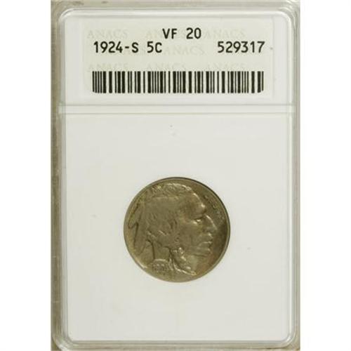 <B>1924-S 5C VF20 ANACS.</B></I> NGC Census: (65/350). PCGS Population (64/469). Mintage: 1,437,000. Numismedia Wsl. Price for NGC/PCGS coin in VF20: $365. (#3953)<BR><BR><B>Coin Engraver:</B> James E. Fraser<BR><BR><b>Shipping:</b> Coins & Currency (<a target="_blank" href="http://www.heritageauctions.com/common/shipping.php">view shipping information</a>)