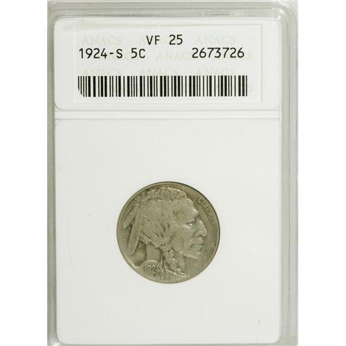 <B>1924-S 5C VF25 ANACS.</B></I> NGC Census: (0/563). PCGS Population (45/411). Mintage: 1,437,000. Numismedia Wsl. Price: $415. (#3953)<BR><BR><b>Shipping:</b> Coins & Currency (<a target="_blank" href="http://www.heritageauctions.com/common/shipping.php">view shipping information</a>)