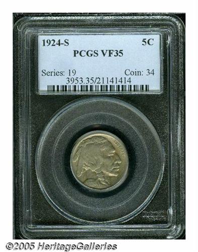 <B>1924-S<5C> VF35 PCGS.</B></I> An evenly worn example of this desirable issue. The 1924-S is a rare, key date in the Buffalo Nickel series. Despite its well circulated condition, this coin has no major impairments, and only a handful of minute surface marks of any kind, along with a few flyspecks on the reverse. The mintmark is sharp.