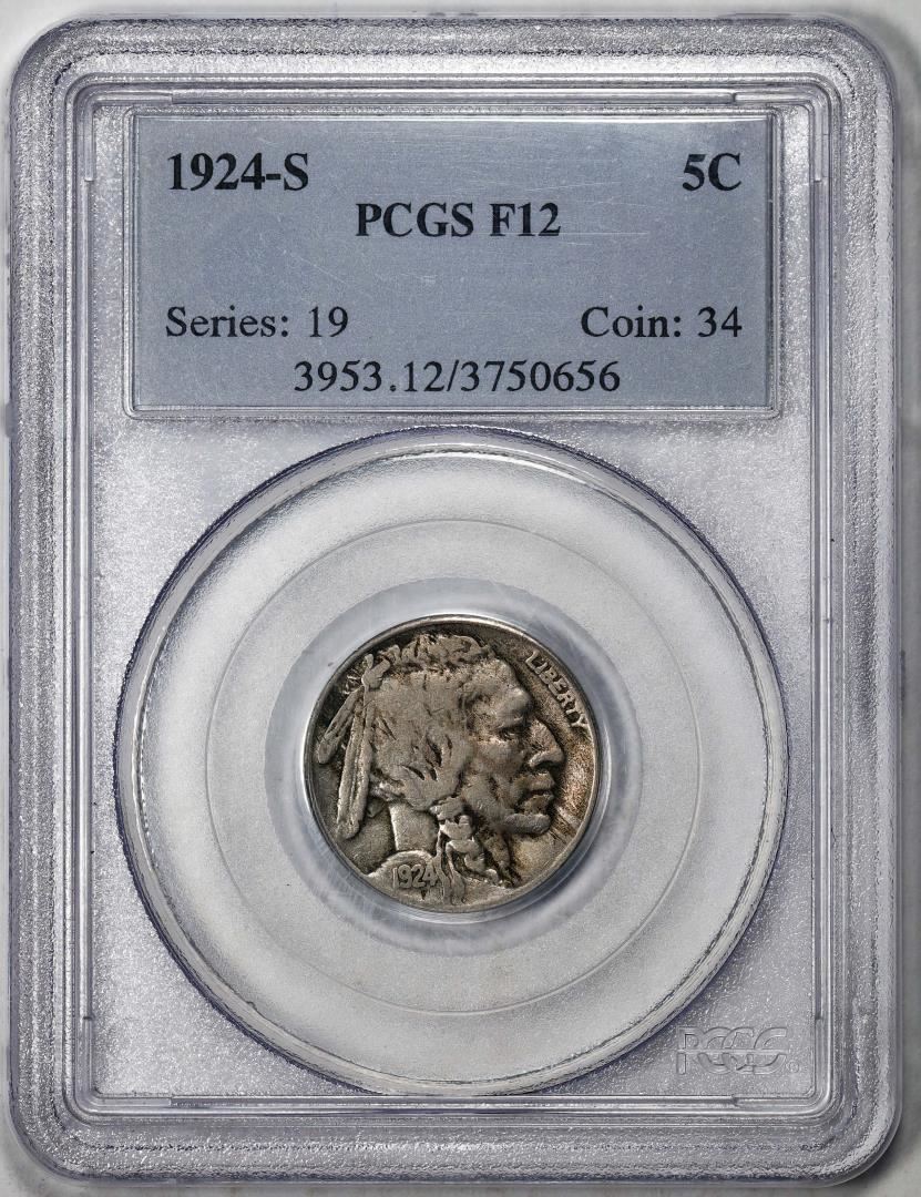 One 1924-S Buffalo Nickel Cent Coin PCGS F12. PCGS Graded.