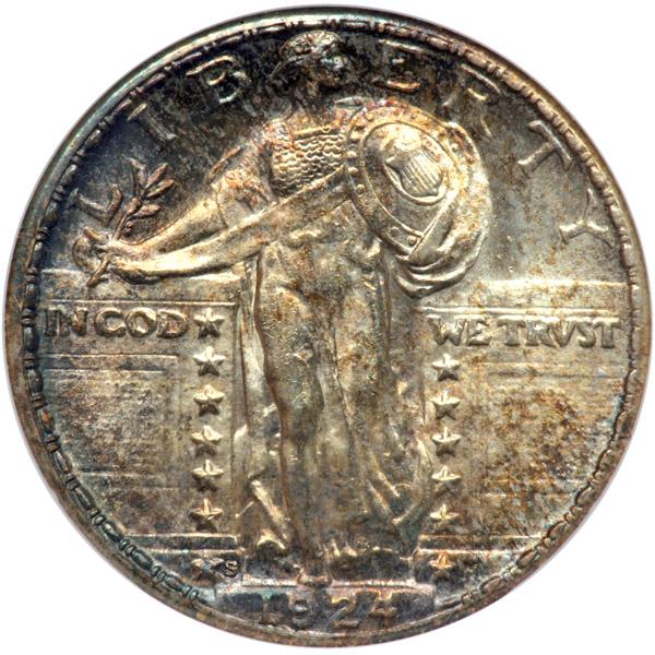 1924-S. NGC graded MS-64 Full Head. Lovely blue and golden-violet toning on both sides. The underlying fields frosty and relatively free of marks. Pop 64; 35 finer in FH.