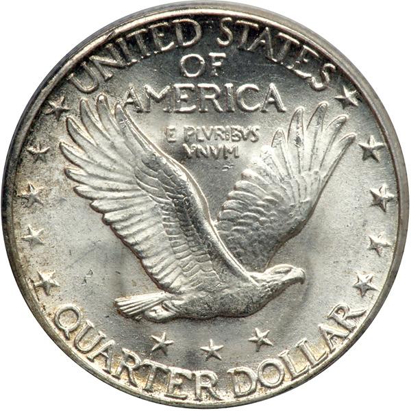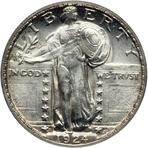1924-S Liberty Standing Quarter Dollar. PCGS graded MS-64 PQ. A nice white coin. Almost a full head.Silver-white satin luster skims along over both sides and is boldly displayed on this fresh-appearing standing Liberty quarter. Here, too, we are struck by the nice, convincing design detail all other areas of this important coin, with only minor flatness on the head. Pop 104; 73 finer, 48 in 65, 24 in 66, 1 in 67 (PCGS # 5750) .
