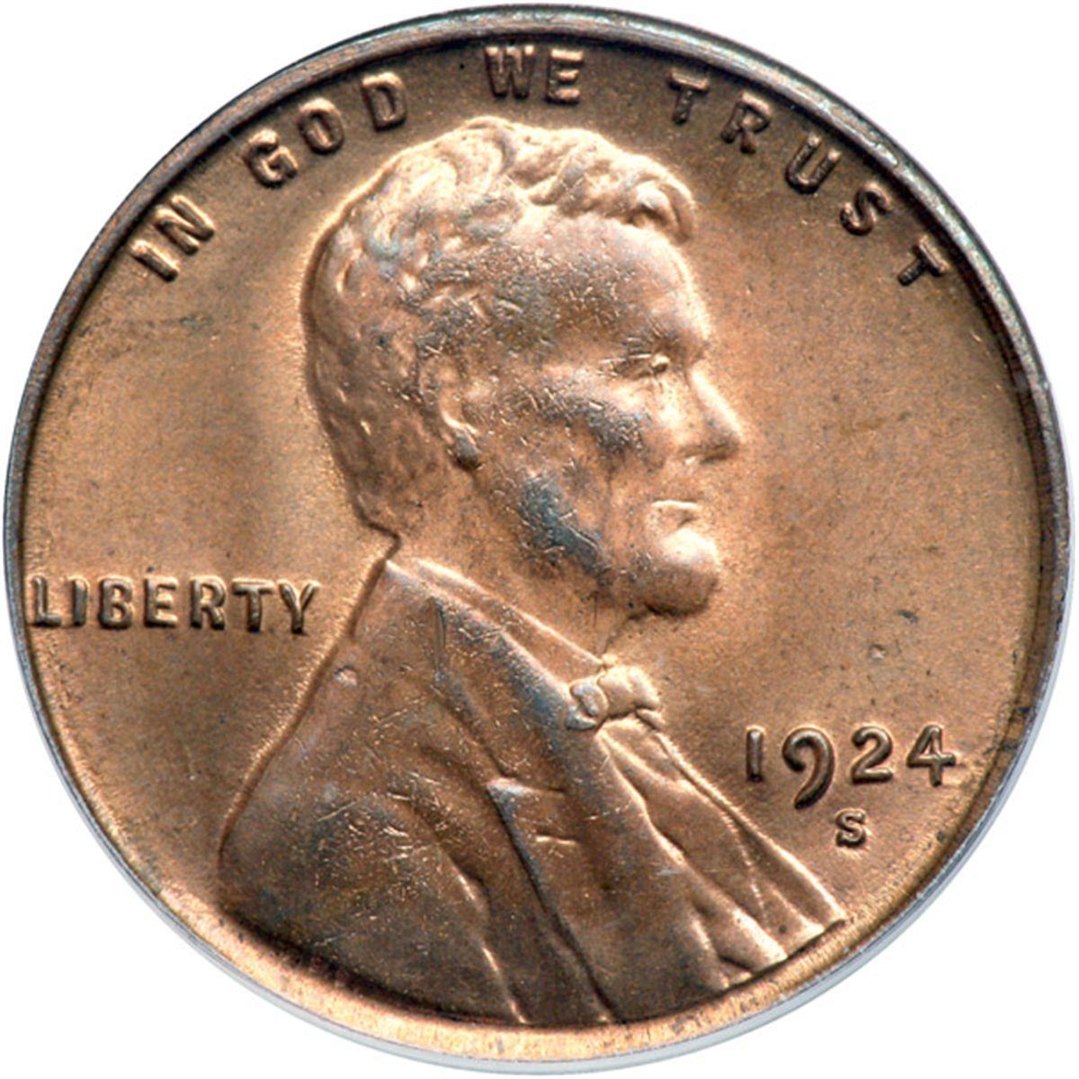 1924-S Lincoln Cent. PCGS graded MS-64 Red & Brown CAC Approved. About 50% mint red visible. Pop 173; 21 in 65 RB (PCGS # 2556) .