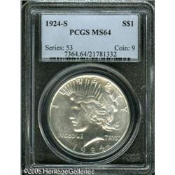 <B>1924-S<img border='0' src='http://www.heritagecoins.com/images/star.gif' width=10 height=10>$1 MS64 PCGS.</B></I> Nicely struck, with bright, lustrous surfaces. Just a few minor marks on Liberty's head and on the eagle. Lot:10703