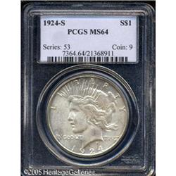 <B>1924-S<img border='0' src='http://www.heritagecoins.com/images/star.gif' width=10 height=10>$1 MS64 PCGS.</B></I> One of the better struck and more well preserved examples of this difficult S-mint issue that we have seen of late, mostly brilliant on the reverse, and showing just a whisper of milky golden color on the reverse. Lot:10704