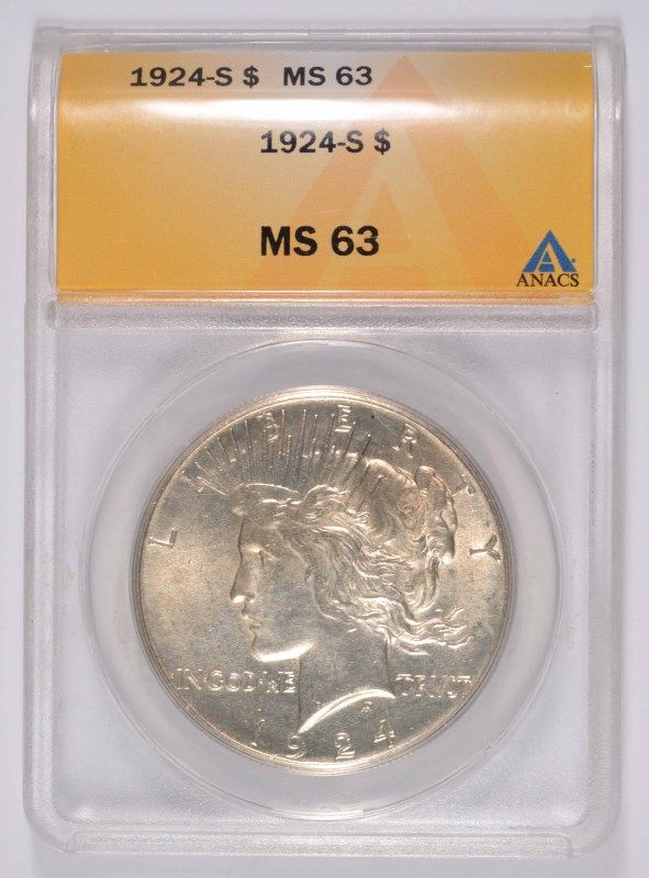 1924-S PEACE SILVER DOLLAR, ANACS MS-63 WHITE