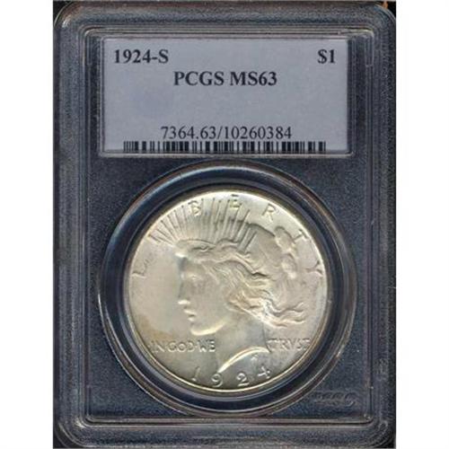 <b>1924-S Peace Dollar. PCGS graded MS63.</b> A brilliant coin with soft faded luster on the choice fields and devices. Scarcer branch mint issue <b>(PCGS # 7364)</b>
