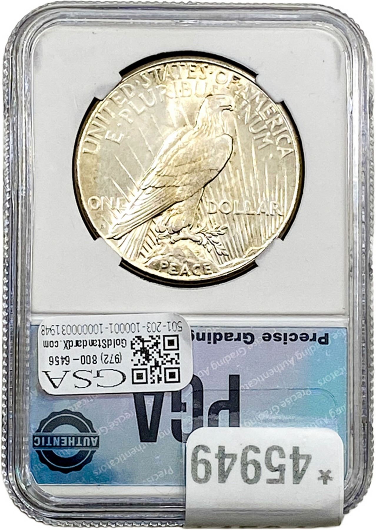 COINS AND CURRENCY LISTED IN GSA’S CATALOG AS GRADED AND ENCAPSULATED BY PCGS, NGC, ANACS, ICG, PCGS CURRENCY, PMG, PCGS BANKNOTE GRADING, CMC OR ANY OTHER THIRD-PARTY GRADING SERVICE ARE LIKEWISE SOLD “AS-IS” EXCEPT AS EXPRESSLY SET FORTH HEREIN. ALL THIRD-PARTY GRADING SERVICE GUARANTEES, INCLUDING AUTHENTICITY, ARE THE SOLE RESPONSIBILITY OF THE THIRD-PARTY GRADING SERVICE AND NOT WARRANTIES OR GUARANTEES OF GSA. BIDDERS SHOULD CONTACT THESE THIRD-PARTY GRADING SERVICES DIRECTLY WITH RESPECT TO ANY CLAIMS OR QUESTIONS THEY MAY HAVE CONCERNING THEIR GUARANTEES AND WARRANTIES. BIDDERS ACKNOWLEDGE AND AGREE THAT AUCTIONEER IS NOT BOUND BY OR LIABLE FOR ANY OPINION OR CERTIFICATION BY ANY THIRD-PARTY GRADING SERVICE. REMOVAL OF A PRODUCT FROM ITS PROTECTIVE CASING OR HOLDER OR ALTERATION OF ANY COIN HOLDER WAIVES ALL RIGHTS CONCERNING THE PRODUCT CONTAINED THEREIN.
