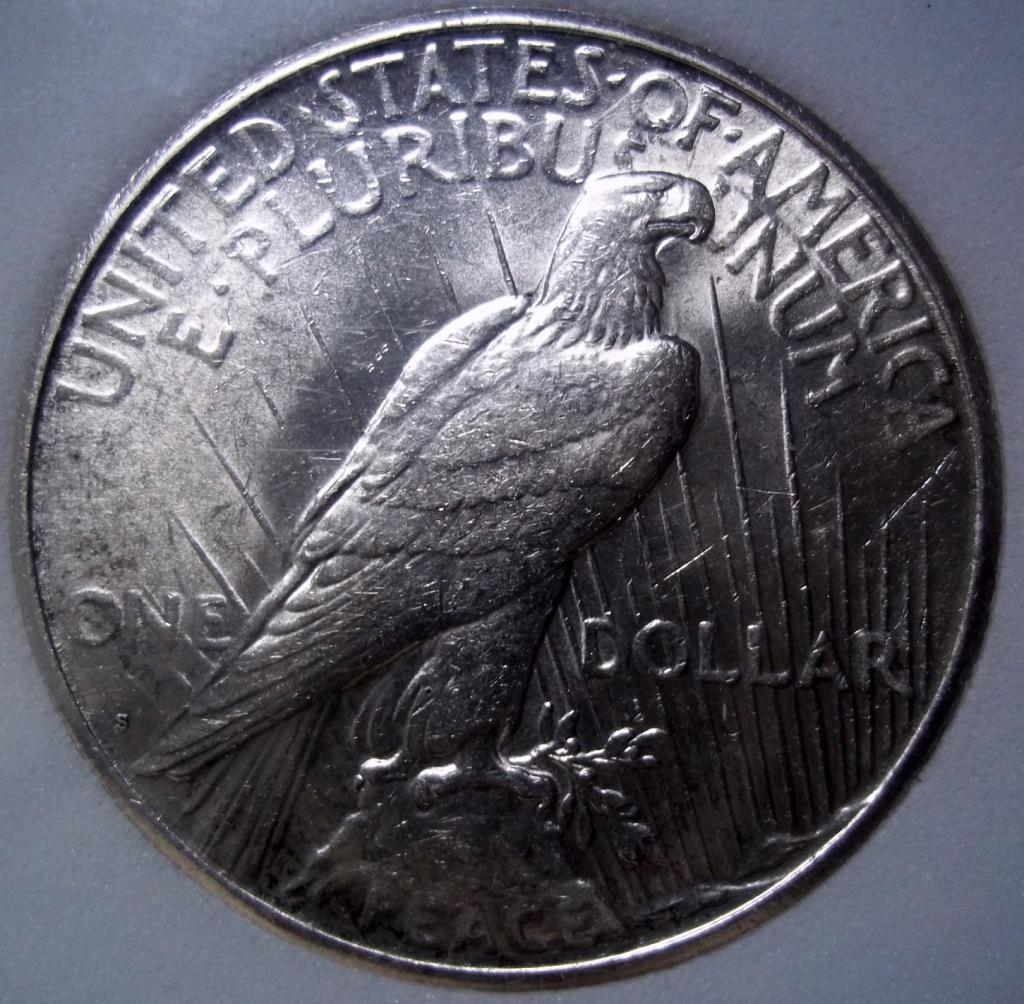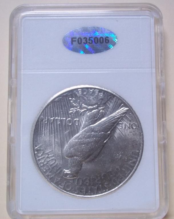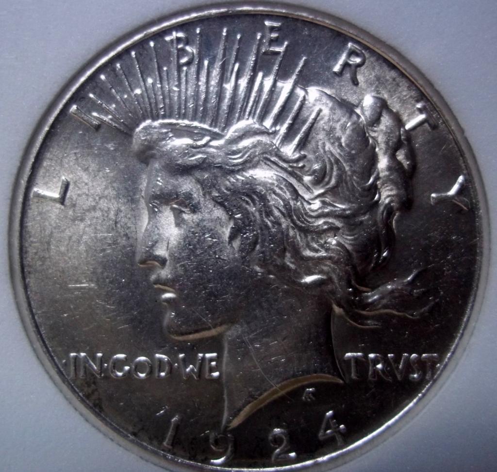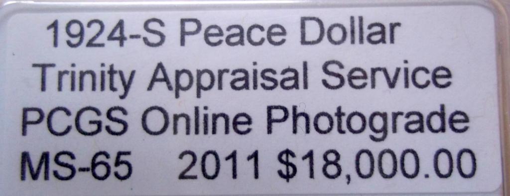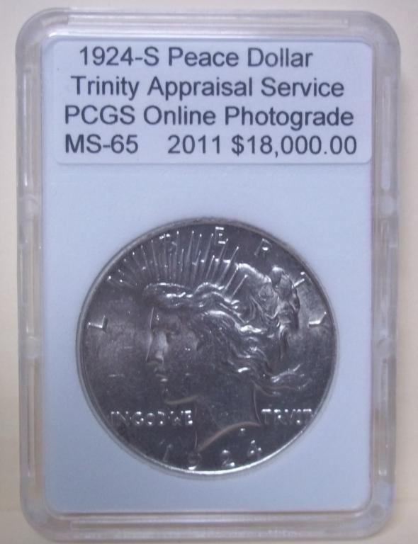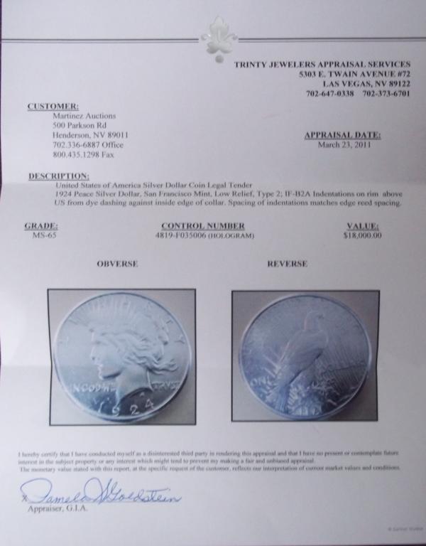 1924 Peace Silver Dollar, San Francisco Mint, Low Relief, Type 2; IF-B2A. Indentations on rim above US from dye dashing against inside edge of collar. Spacing of indentations matches edge reed spacing. PCGS Online Photograde. Appraised by Trinity Jewelers Appraisal Services. Control# F035006. Value: $18,000.00