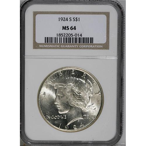 <B>1924-S<img border='0' src='http://www.heritagecoins.com/images/star.gif' width=10 height=10>$1> MS64 NGC.</B></I> A frosty example with milky spots of toning on each side. Nicely struck for the issue with a faint emerald cast to the fields. Nicely preserved overall, though with a few too many marks for Gem status.