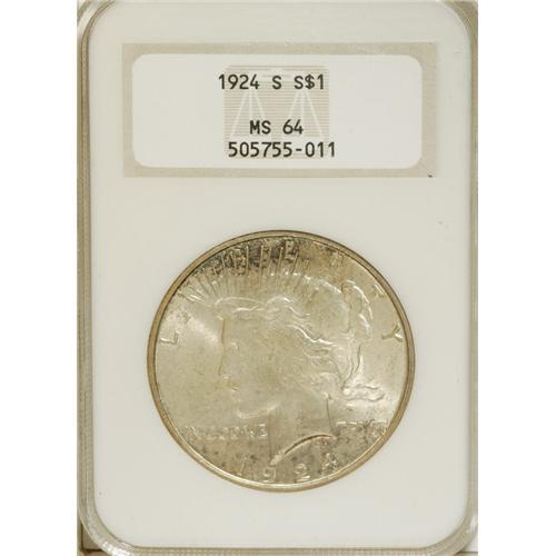 <B>1924-S S$1 MS64 NGC.</B></I> Pale peach and gunmetal-gray embrace this lustrous and attractively preserved lower mintage Peace dollar. The strike is crisp for the San Francisco Mint. Encased in an older generation holder.<BR><BR><b>Shipping:</b> Coins & Currency (<a target="_blank" href="http://www.heritageauctions.com/common/shipping.php">view shipping information</a>)
